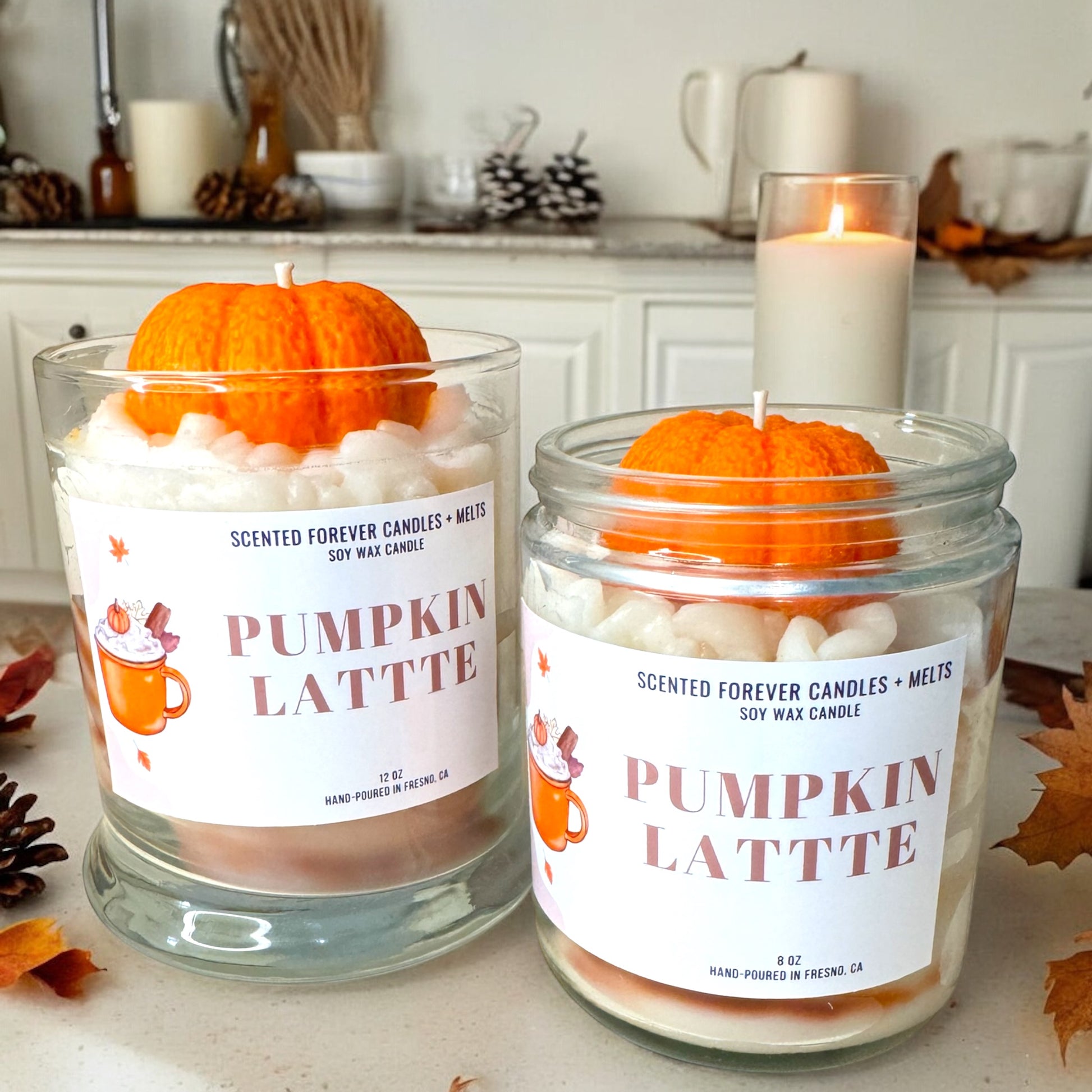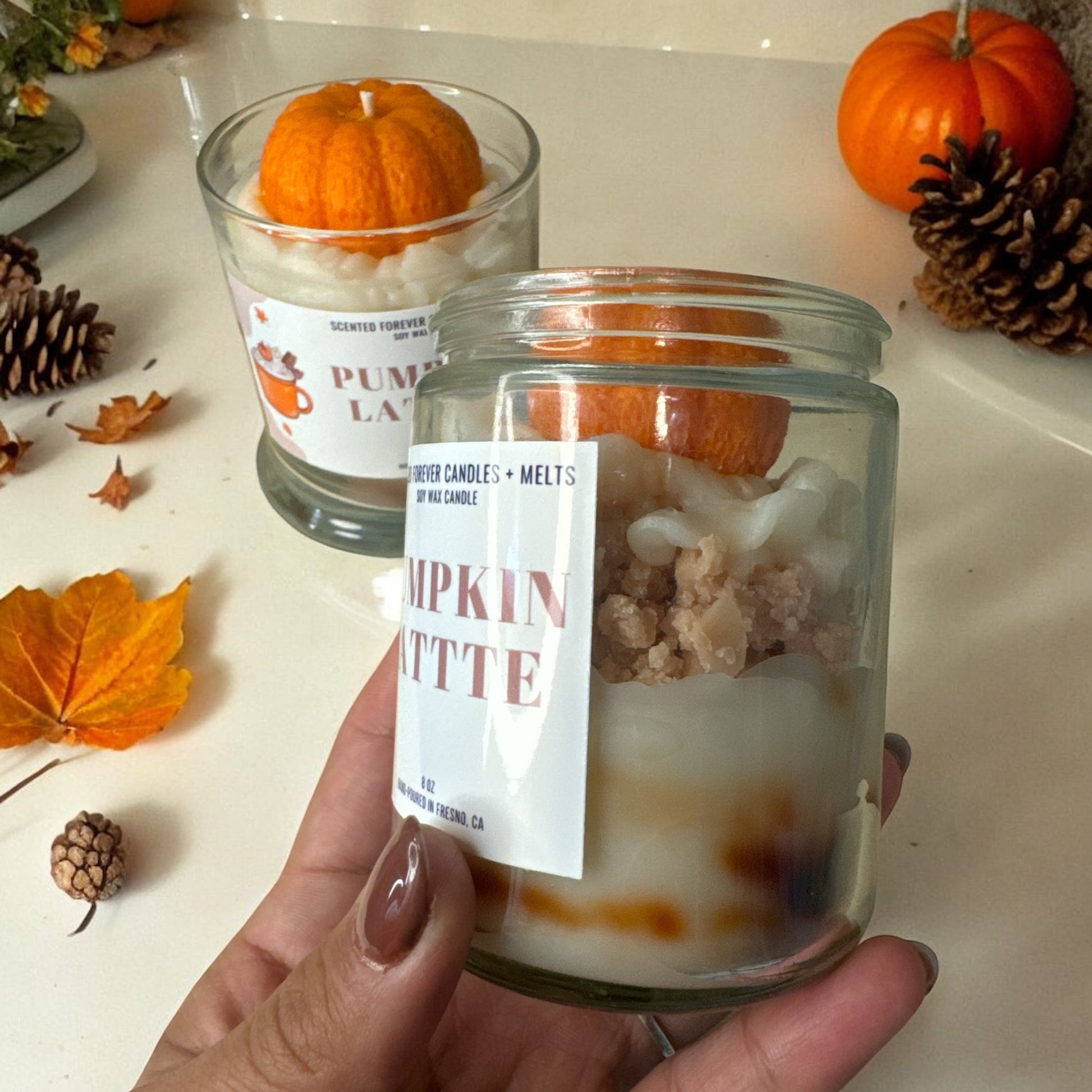Indulge in the perfect fall treat with our Pumpkin Latte candle. Enjoy the cozy and warm scent of cinnamon, nutmeg, coffee, and vanilla. Perfect for pumpkin and coffee lovers, this fragrance is a must-have for the season. Experience a fall favorite straight to your home.